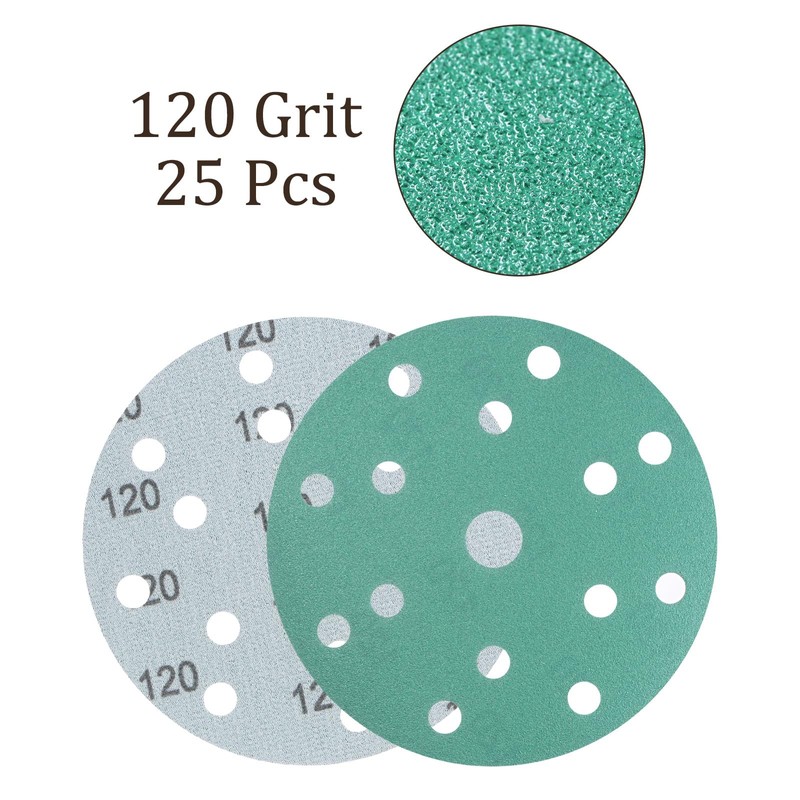 Kozelo 25pcs Green Film Sanding Discs - [6 Inch 120 Grits 15 Hole ] Round Aluminum Oxide Hook & Loop Wet Dry Sander Pads for Wood Metal Polishing Use| Zirconium Corundum Sandpaper