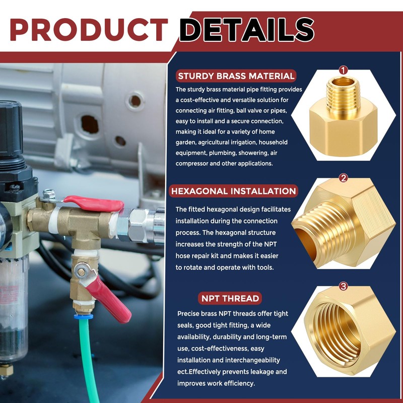 • 5. Aesthetically Pleasing and Universal Applications: Brass adds an elegant touch to any plumbing system, enhancing the overall appearance.Suitable for user tending gardens, lawnmowers and irrigation systems,—these fittings adapt to your diverse needs.