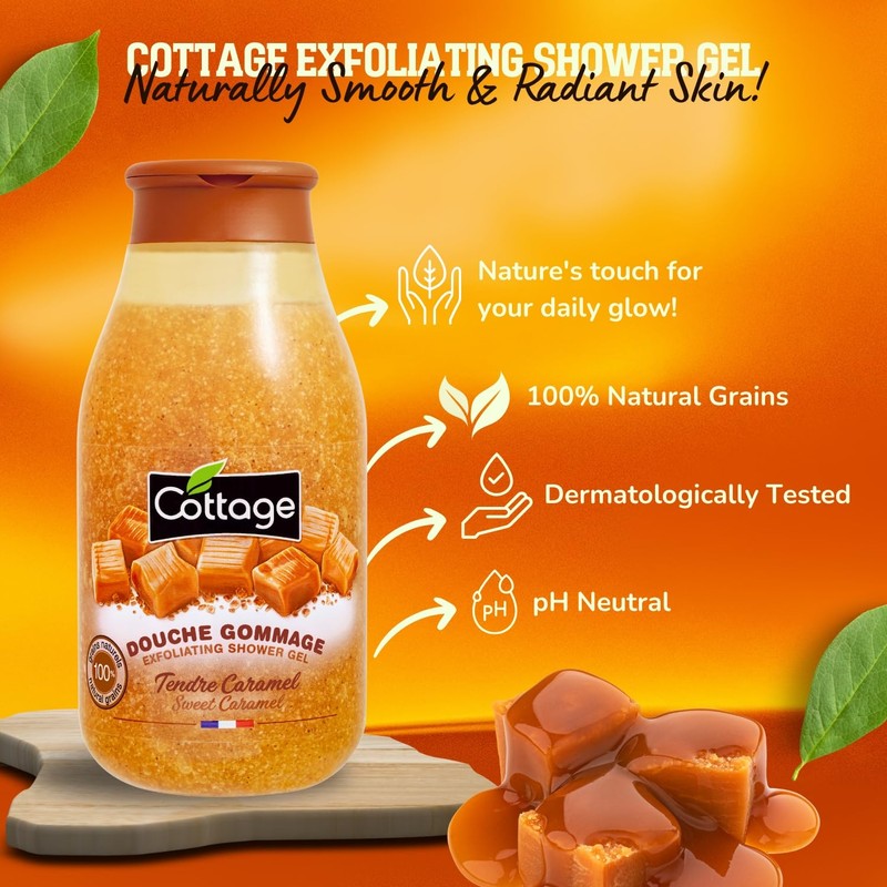Product DescriptionCottage Exfoliating Shower Gel – Delicious Caramel Fragrance, 100% Natural Exfoliating Grains, Hydrating & Softening, Dermatologically Tested – 270mlIndulge in a sweet, luxurious exfoliating experience with Cottage Exfoliating Shower Gel. Formulated with 100% natural exfoliating micro-particles, this gentle scrub removes dead skin cells while maintaining hydration and softness. Infused with sugar and a rich caramel fragrance, it leaves your skin feeling smooth, nourished, and delicately scented after every use.Key Benefits: 100% Natural Exfoliating Grains – Gently removes dead skin cells for a smooth, refined texture without irritation. Delicious Caramel Fragrance – A warm, indulgent blend of caramel, creamy milk, and vanilla for a comforting, long-lasting scent. Hydrating & Softening Formula – Enriched with sugar to deeply nourish and restore skin's suppleness. Extra Gentle Scrub – Provides non-abrasive exfoliation while preserving skin's natural softness. Dermatologically Tested – Safe for all skin types, including sensitive skin, for daily use. pH-Neutral Formula – Respects the skin's natural balance for a healthy, irritation-free cleanse.Why Choose Cottage Exfoliating Shower Gel? Paraben-Free & Skin-Friendly – Gentle enough for everyday use. Non-Abrasive Exfoliation – Smoothes and refines skin without harsh scrubbing. A Spa-Like Shower Experience – Leaves skin feeling refreshed, silky, and beautifully scented.Transform your shower into a moment of indulgence with Cottage Exfoliating Shower Gel.Safety WarningFor external use only