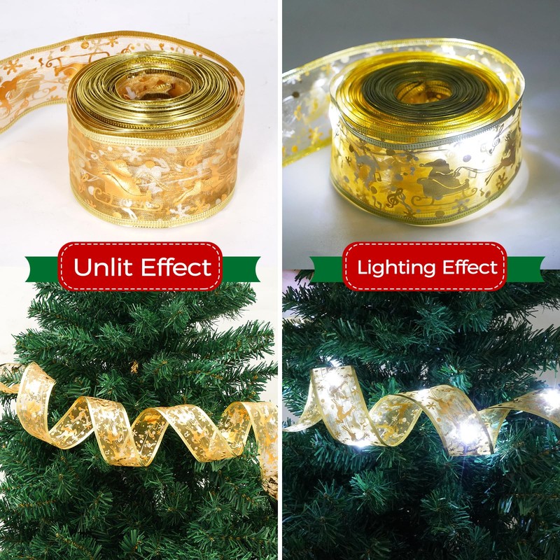 - Christmas Tree Ribbon Bow Lights: Double-deck cloth with gold santa and deer pantern printed and gold edge are great decorations for your Christmas tree, yard, garden, room, ladder, wedding, and party