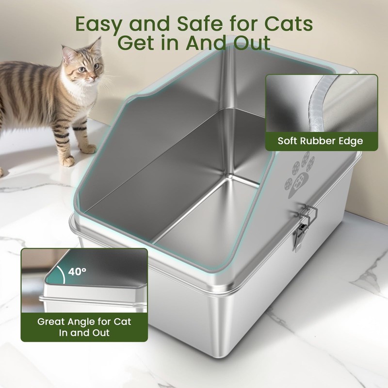 - Easy to Assemble & Stable: This stainless steel cat litter box is simple to assemble, featuring an upgraded clip design that ensures the lid is securely attached to the litter box. Don't worry about the lid coming off even cats jumping. XL litter box structure is highly stable, preventing the outer shell from coming loose or being kicked off, ensuring safety and reliability.