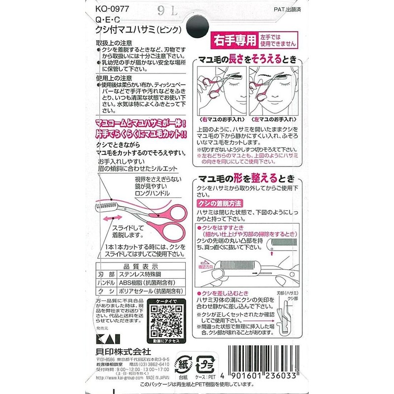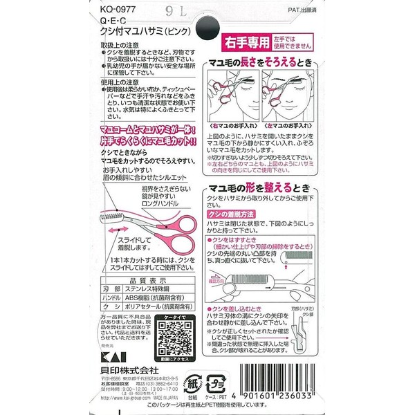 貝印 KQ0977QECクシ付マユハサミ ピンク 眉のお手入れに