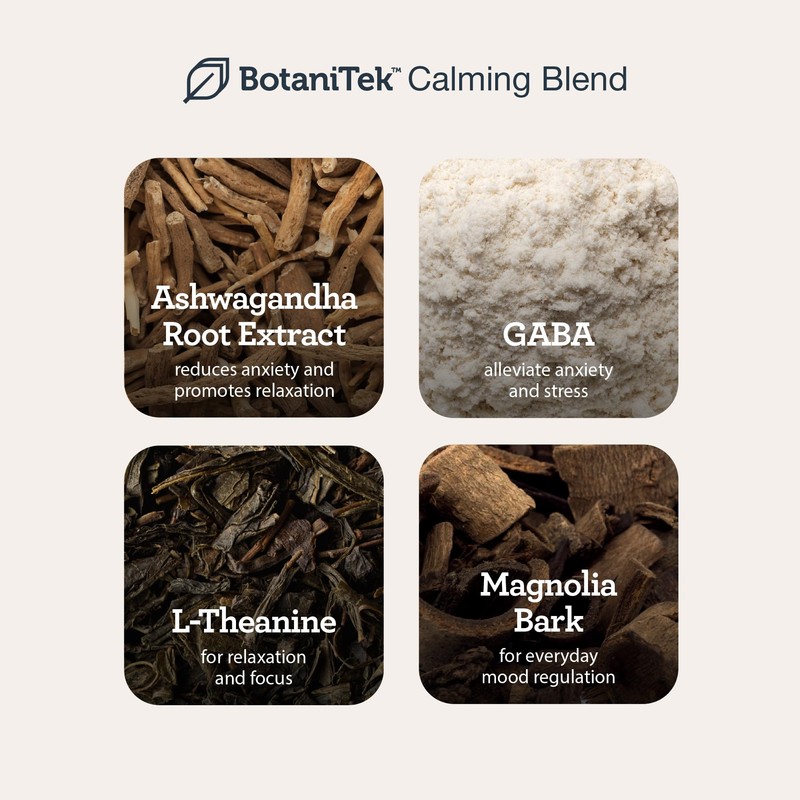 - POWERED BY BOTANITEK CALMING BLEND – Formulated with Ashwagandha, Chamomile, L-Theanine, GABA, and Passion Flower, this scientifically backed blend helps regulate stress levels and promote relaxation.