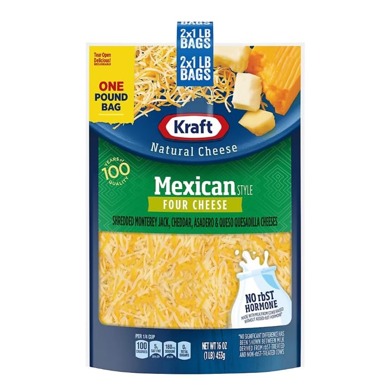Mealtime can be hard, especially when it comes to making something everyone agrees on. Use Kraft Finely Shredded Mexican Style Four Cheese Blend to make something everyone will love, so you can spend time focused on each other and not worried about making everyone happy. Make taco night everyone's favorite night with this Mexican style cheese! This shredded Monterey Jack, cheddar, queso quesadilla, and asadero cheese adds authentic flavor to your family's favorite dishes, as it's made with an expert blend of shredded Mexican style cheese. This finely shredded cheese comes pre-shredded for easy meal prep to be used in your familys favorite taco salad, tacos, quesadillas, and more. Each bag is resealable to help lock in flavor. Made with milk from cows raised without added rbST hormone. No significant difference has been shown between milk derived from rbST-treated and non-rbST treated cows.