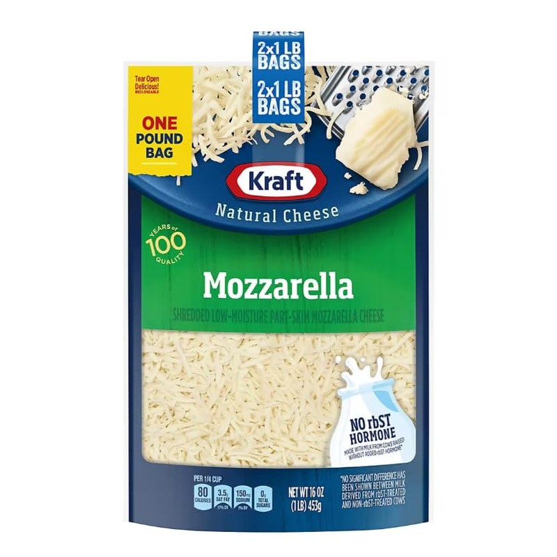 - Includes shredded mozzarella cheese, 2 pack of 1-pound bags
