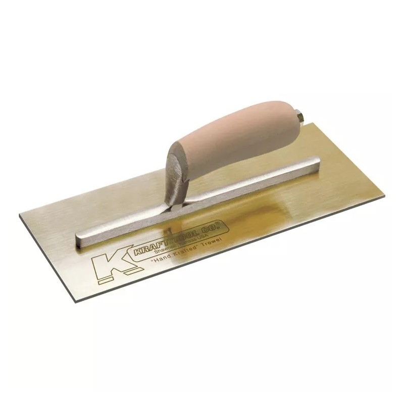 Elevate your craftsmanship with Kraft Tool's 12 x 5 Golden Stainless Steel Finish Trowel, engineered with a Camel Back Wood Handle for ultimate comfort and precision. Ideal for professionals, this trowel is not just a tool—it's a statement of quality. The blade is crafted from heat-treated golden stainless steel made of a special alloy that resists rust, pitting, and staining.
