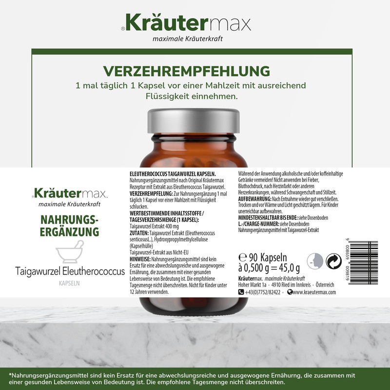 Dietary supplement according to original Kräutermax formula with extract of Eleutherococcus taiga root.