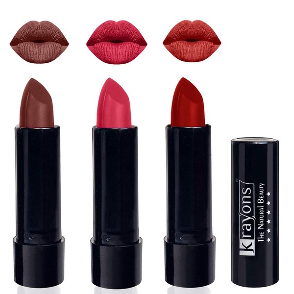 Krayons Cute Pop Matte Lipstick, Waterproof, Smudgeproof, Brick Tone, First Crush, Centre Stage, 3.5gm Each (Pack of 3)