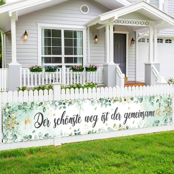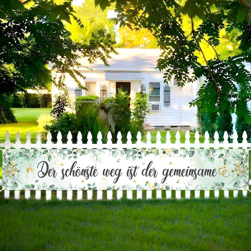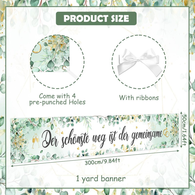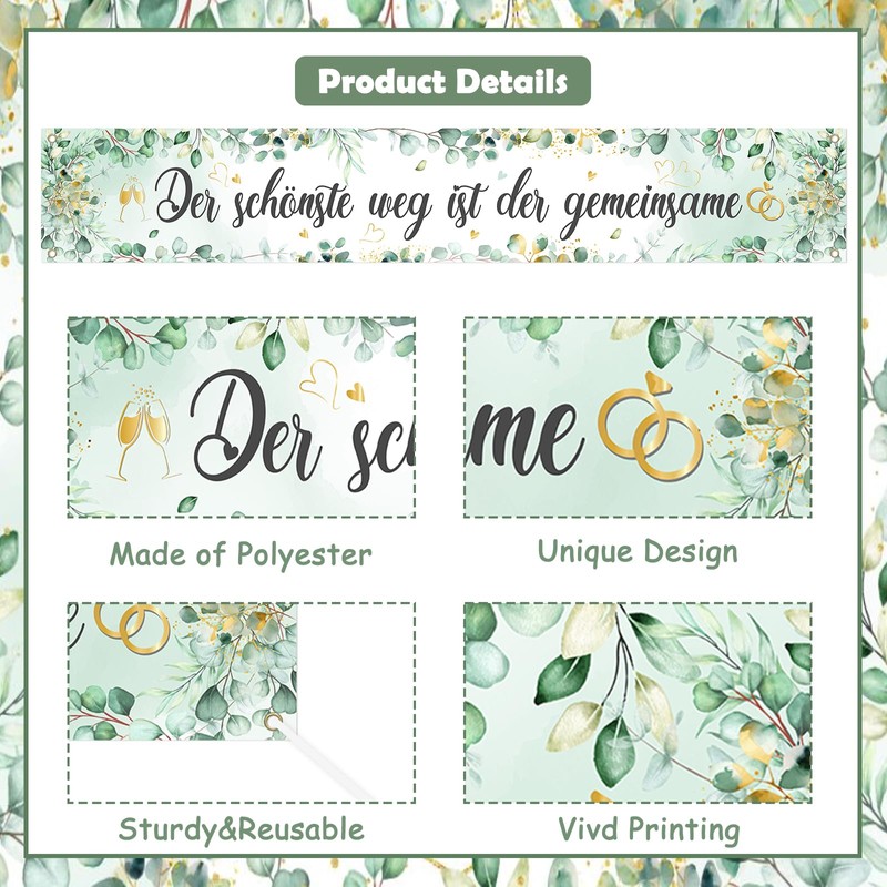 - Green Wedding Banner:Beautiful wedding decoration banner with romantic German phrase "The most beautiful way is the together". Delicate eucalyptus leaf pattern with watercolor effect, decorated with gold hearts and wedding ring motifs on a gentle mint background