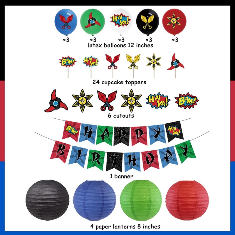 - Complete Party Set: Includes 1 x ninja happy birthday banner, 4 x paper lanterns(1*red, 1*black, 1*green, 1*blue), 12 x cupcake toppers, 15 x balloons(3*blue, 3*green, 3*white, 3*black, 3*red) and 6 x ninja party favor cards for a fully immersive ninja themed birthday celebration.