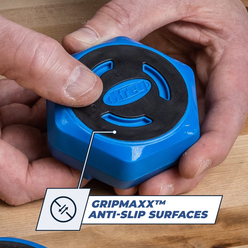 Kreg Multipurpose Project Blocks are the perfect way to support, hold, and work on projects anywhere. These incredibly versatile blocks elevate your material to sit 1-1/2" above the work surface for convenient sanding, finishing, routing, and much more. The Blocks feature a GripMaxx™ surface on each face – one side to grip your workpiece, and one side to prevent the Blocks from moving around on your workstation. That's great for tasks like sanding when you don't want anything slipping and sliding. Elevating the material makes routing edges easier with added clearance for the router bit. The height also gives clamps room to fit the clamp head under the workpiece – which is useful for drilling pocket holes or assembling your project. When it comes to painting or finishing, use the retractable painting point with GripMaxx™ for a little extra height. Just twist the project block to raise the point to rest your material on – the painting points won't even stick to it or ruin your finish.