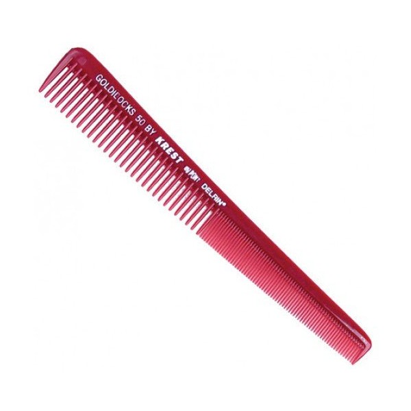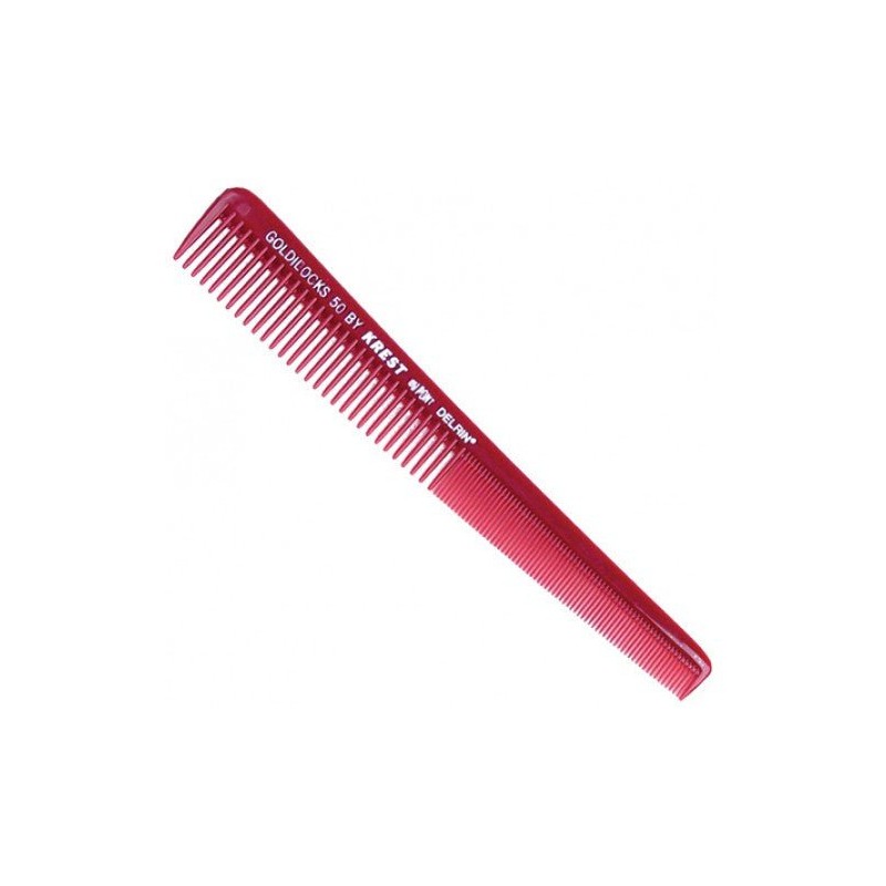 Krest No. 50 Tapered Cutting Comb - 18 cm is a professional-grade cutting comb made from DuPont Delrin for added strength, low friction, and heat resistance, with wide teeth for low tension combing on thick or curly hair and fine teeth for precision cutting with tension and control.