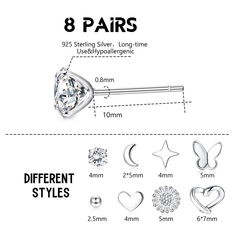KRFY 8 Pairs Stud Earrings for Women Sterling Silver Small CZ Butterfly Moon Star Daisy Love Ball Hypoallergenic Plain Stud Earrings Tiny Cartilage Stud Earrings for Teen Girls