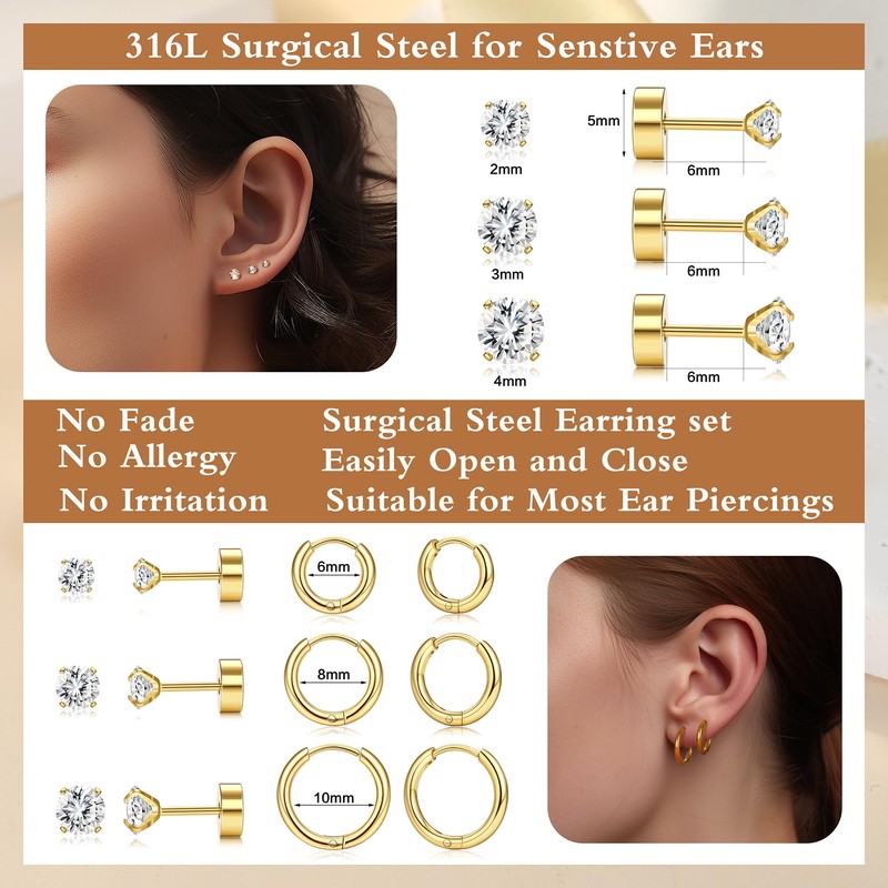 • Stainless Steel Earrings: Theae studs and hoop earrings are all made of 316L Stainless Steel . The thin body and posts are lighter than most cartilage stud earrings. They fit for standard lobe and upper lobe, as well match for helix piercing jewelry,nose piercing jewelry,tragus piercing jewelry,conch piercing jewelry,daith piercing jewelry,lip piercing jewelry,labret piercing jewellery also for matching with other ear piercing jewelry!