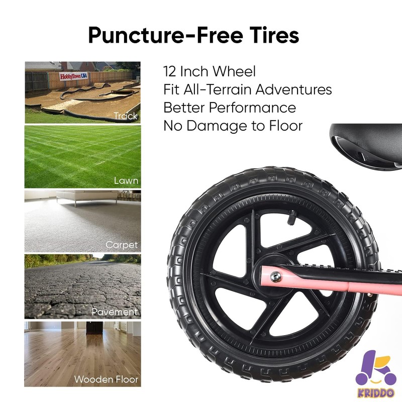 - EXTRA-THICK ALL-TERRAIN TIRES – We want kids to feel strong and stable when they’re moving on grass and sidewalks which is why we added puncture-resistant tires to the front and back of each balance bike for 5-year old’s and 24-month-old riders.