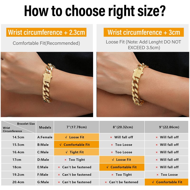 - High quality: Classic curb chain design bracelets made of 316L stainless steel, double electronic PVD electroplating technology for a lasting shine: the surface is coated with 18K gold so that your skin does not turn green, and the colour does not fade for 1-3 years. It can ensure that each stainless steel Cuban bracelet reflects a lot of light to achieve this bling effect.