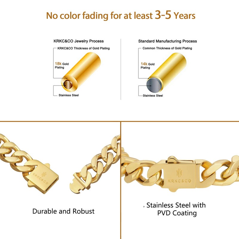 - High quality: Classic curb chain design bracelets made of 316L stainless steel, double electronic PVD electroplating technology for a lasting shine: the surface is coated with 18K gold so that your skin does not turn green, and the colour does not fade for 1-3 years. It can ensure that each stainless steel Cuban bracelet reflects a lot of light to achieve this bling effect.