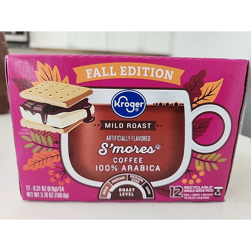 Brand new box of limited edition Kroger coffee k-cups for Fall. Flavor is Smores and is a mild roast. New box of 12 pods.