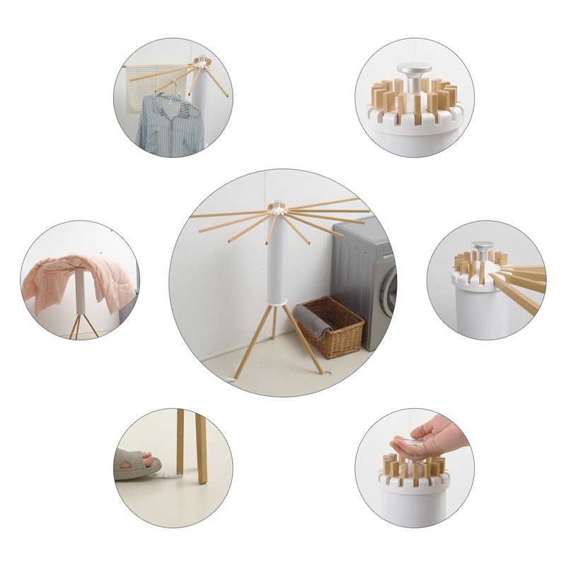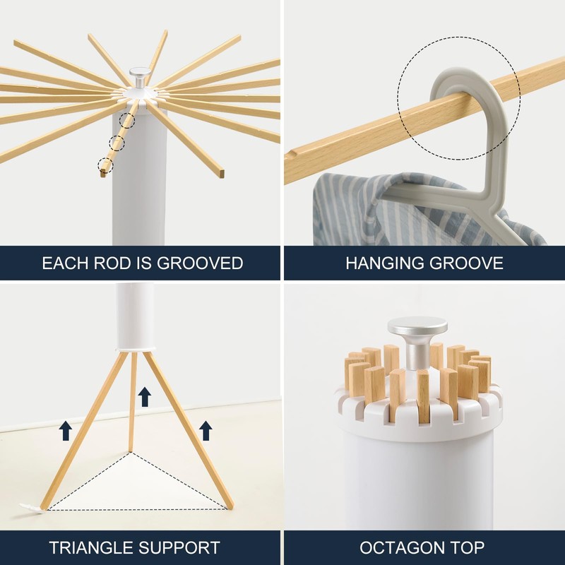 - 16 Expandable Arms: The wooden drying clothes rack has 16 expandable drying rods. You can expand the number of arms you need according to the space and usage needs, which makes the clothes drying rack suitable for different corners.