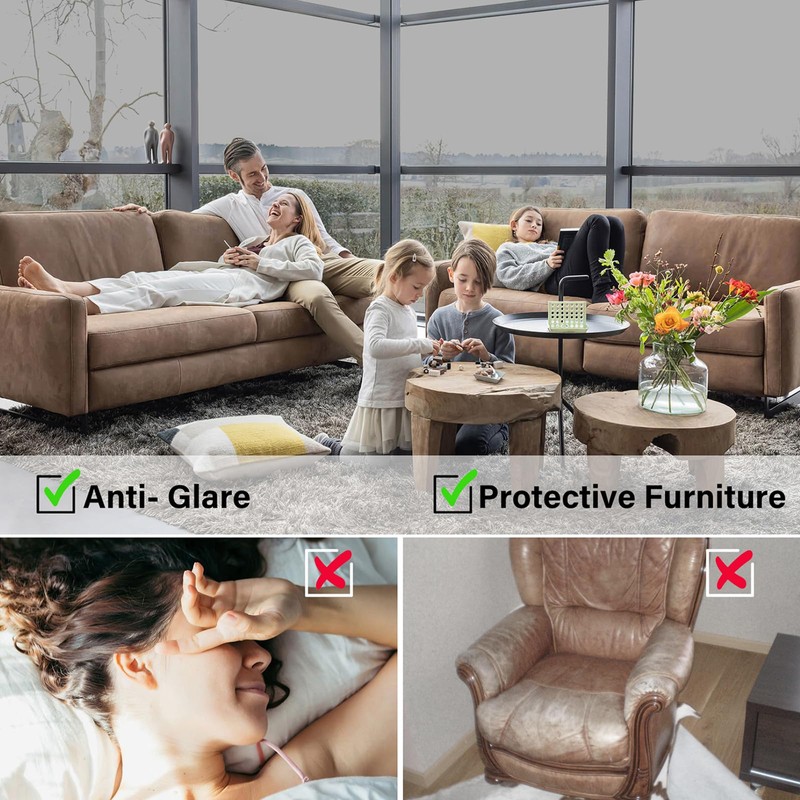 - SUN BLOCKING & ANTI-GLARE: Say goodbye to direct sunlight and Annoying glare! Our one way window film efficiently block out 97% of harmful UV rays and 85% of infrared rays, reduce the fading and aging of interior furnishings, protect your skin health prevent sunburn. It also let some soft light enter the room, not only to block the harsh light and reduce glare, but also to maintain your good view