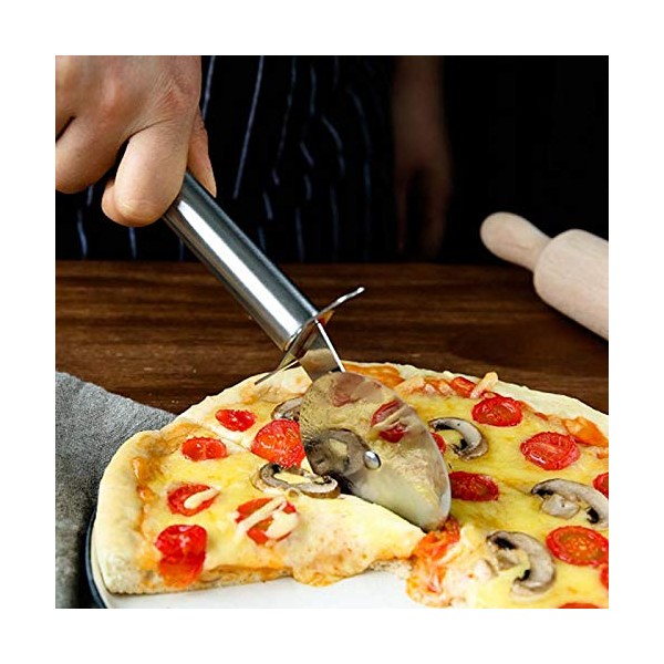- With this pizza knife disc, you can cut the pizza perfectly into pieces and do not have to press so hard. The round blade cuts the pizza in two halves in one operation.