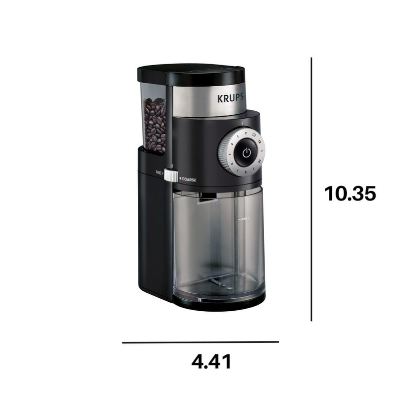 Elevate your coffee experience with the KRUPS Precision Burr Coffee Grinder. This versatile tool features 12 precision settings, allowing you to customize your grind size from fine to coarse, perfect for various brewing methods including drip coffee, french press, espresso, pour over, and cold brew. Powered by a 110-watt motor, the flat metallic burr mechanism ensures uniform grinding for consistent flavor extraction. The burr design preserves your coffee's aromatic qualities by maintaining optimal grinding speed and minimizing heat build-up. With its 8 oz bean hopper and removable grounds container, this grinder can produce enough coffee for up to 32 cups, accommodating both individual servings and larger batches efficiently. User-friendly operation includes an intuitive on/off button with auto-stop function. Select the number of cups (2-12) for precise measurements, reducing waste. The removable top burr and included cleaning brush make maintenance simple. Constructed with durable stainless steel, this grinder is built to last and maintain consistent performance. Its sleek design complements modern kitchens while delivering professional-grade results at home. To use, select your desired grind size using the 12-point scale. For french press or cold brew, use a coarser grind; for drip coffee, choose medium; and for espresso, opt for fine. Always use fresh, whole beans for the best flavor. Fill the hopper, select the number of cups, and press start. For optimal flavor, grind your beans just before brewing. To clean, unplug the grinder, remove the top burr, and use the included brush to clean residual grounds. The removable grounds container can be washed with mild soap and water; ensure it's dry before reassembling. KRUPS backs this grinder with a two-year warranty. Whether you're a coffee connoisseur or just starting your journey into freshly ground coffee, the KRUPS Precision Burr Coffee Grinder delivers consistent, flavorful results with every brew.