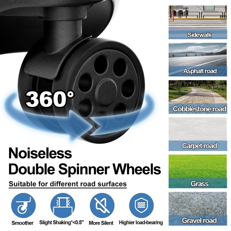 - 【360° Spinner Double Wheels】Glide through your adventures with grace using the 4 Universal Wheels mounting spinner luggage. And it get benifits from PC+ABS hard shell that makes it solid and anti-scratch,keeping your suitcase intact on your short trips