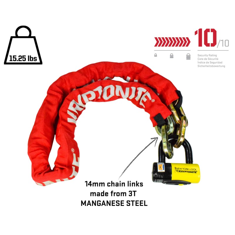 Product Description 14mm six-sided chain links made of 3t HARDENED MANGANESE STEEL weighing 15 LBS built for ultimate strength. Durable, protective nylon cover with hook-n-loop fasteners to hold in place. Includes maximum security New York Disc Lock with 15mm MAX-PERFORMANCE STEEL SHACKLE. Patented*, oval hardened STEEL CROSSBAR for extra security. Hardened DOUBLE DEADBOLT locking for extensive holding power. HIGH SECURITY DISC-STYLE CYLINDER with reinforced anti-drill, anti-pull protection system. SLIDING DUSTCOVER protects and extends cylinder life. 3 STAINLESS STEEL KEYS – one lighted with high intensity bulb and replaceable battery. Key Safe Program.Product dimensions: 5’ (150cm) chain length, 15mm shackle diameter.