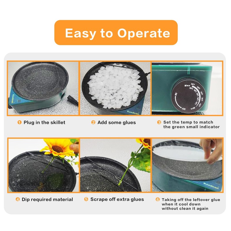 - Temperature Control. Heating temperature can be set from 212°F to 392°F by using knob. You can melt all types of glue with our pot, such as Keratin glue yellow, Italian glue white and yellow Keratin Bond glue sticks.