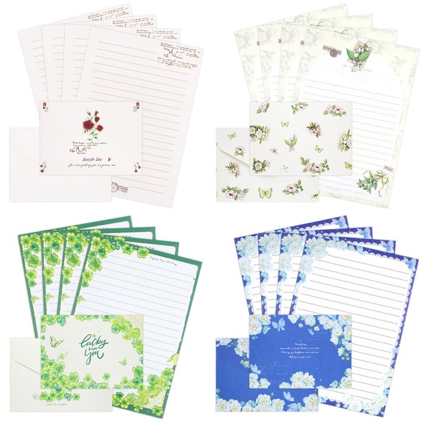 KSIWRE 4-Themed 32-Piece Stationery Set: Rose, Clover, Blue & Gardenia Envelo...