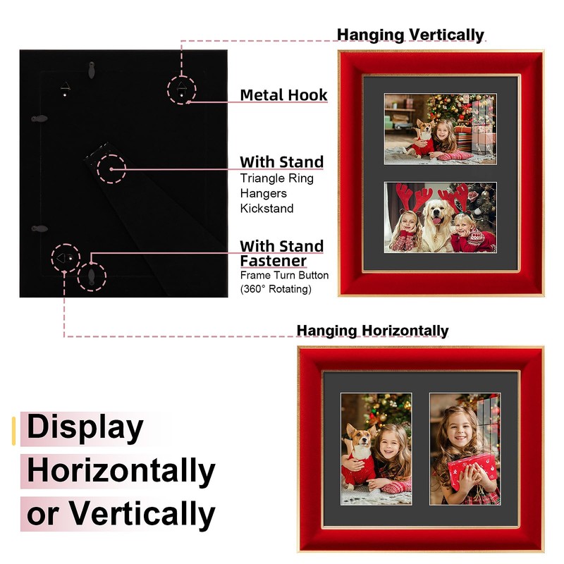 - 【VELVET PICTURE FRAME】Ksroecud 8x10 velvet picture frames with 2 Openings 4x6 Pictures that is combined with a vintage red velvet and metallic border, black with white border mat is a stunning frame that draws the eye to the beauty photo on display. These unique photo frames will add a punchline to your tabletop or wall decor, making your home or office more personal and captivating.