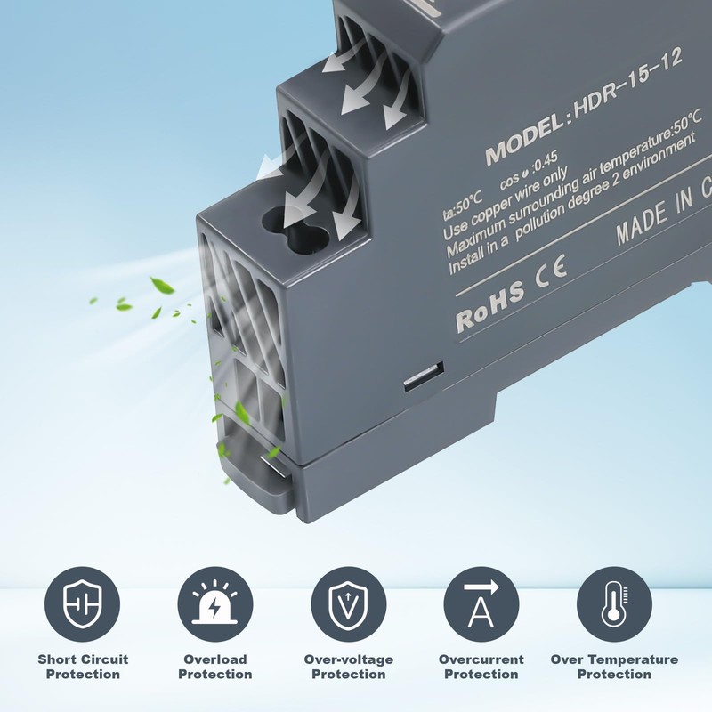 - Easy installation: thanks to a practical locking system, the 12 V DIN rail power supply can be quickly and safely mounted on standardized DIN rails TS 35/7.5 and TS 35/15.