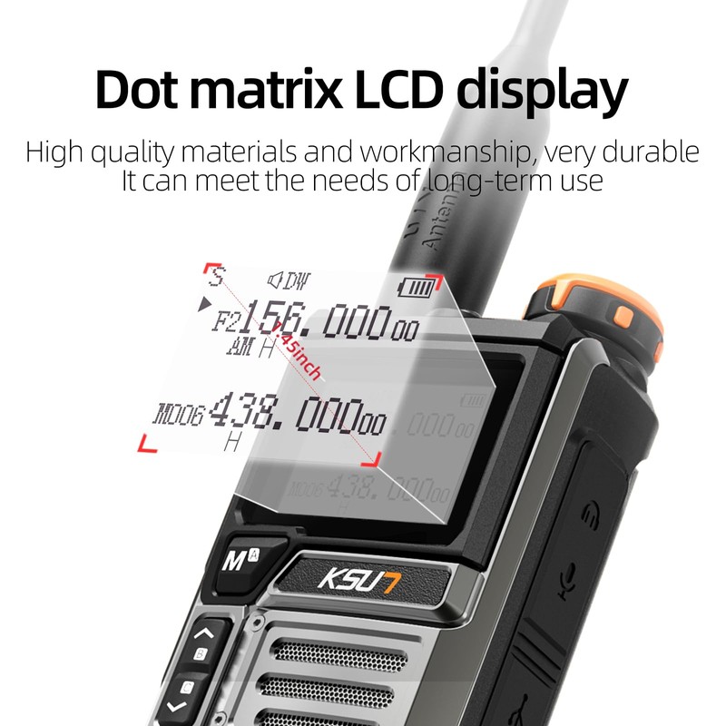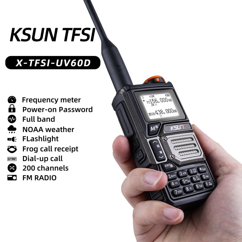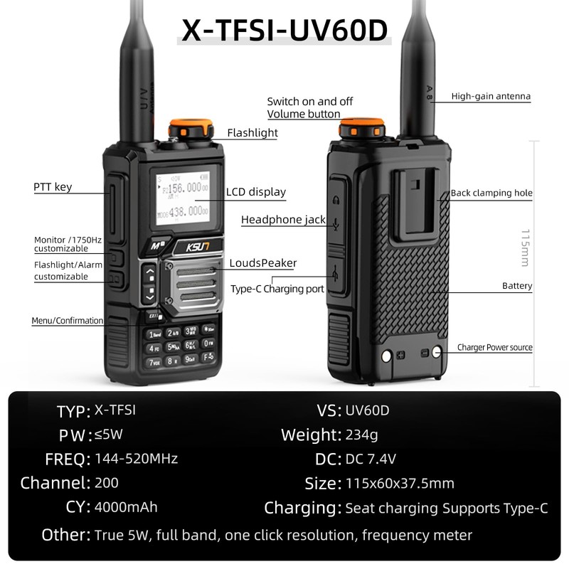 - [Basic Functions]:The UV60D GMRS walkie-talkie is an affordable, high-performance two-way radio introduced by KSUN TFSI in 2024. In addition to the basic features, it has a wide range of high-tech features that make it stand out from the crowd of two-way radios. It is the first intercom to support USB-C cable programming for firmware updates. It also offers DTMF/10-Group Scrambler/Emergency Alert/FM Rdio/TYPE-C or Base Charger/Multi-Scan/CTCSS/DCS/One Key Call Channel/Jacklight/200 Channels/H&M&L Power/4000mAh Li-ion Battery