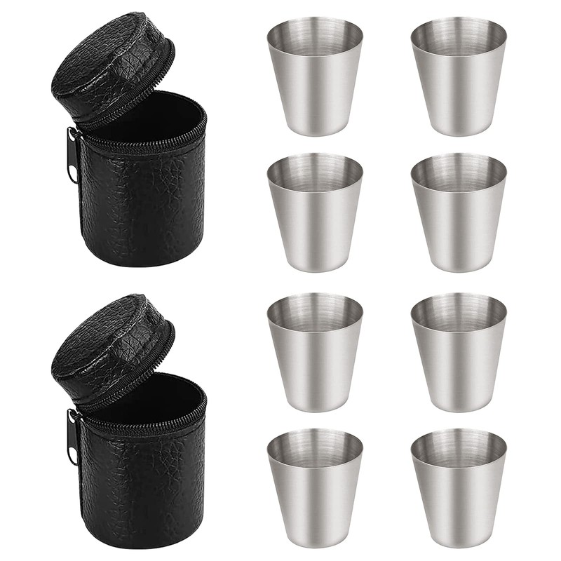 - You will receive a total of 8 stackable metal cups and 2 practical black leather cases. Each mug has a capacity of 70 ml. Larger volume suitable for children and adults.