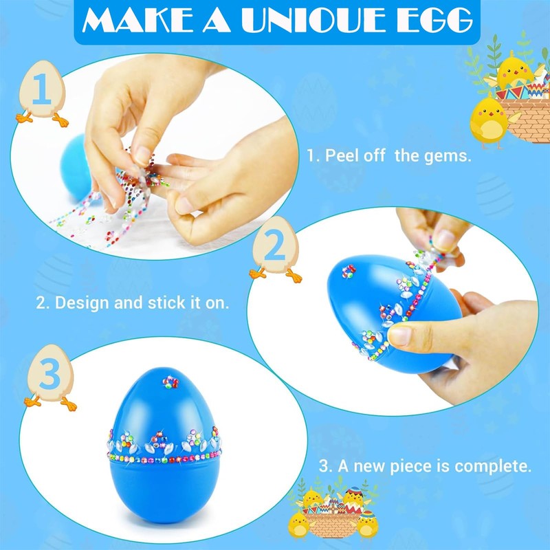 - Easy Decorating with Accessories: To make your Easter décor even more dynamic, we include 6 gem stickers that allow you to further personalize each egg. Decorate your plastic Easter eggs with these eye-catching designs to transform them into beautiful decorations. Use them during your Easter egg hunts or as table centerpieces, providing a unique twist to traditional Easter practices.