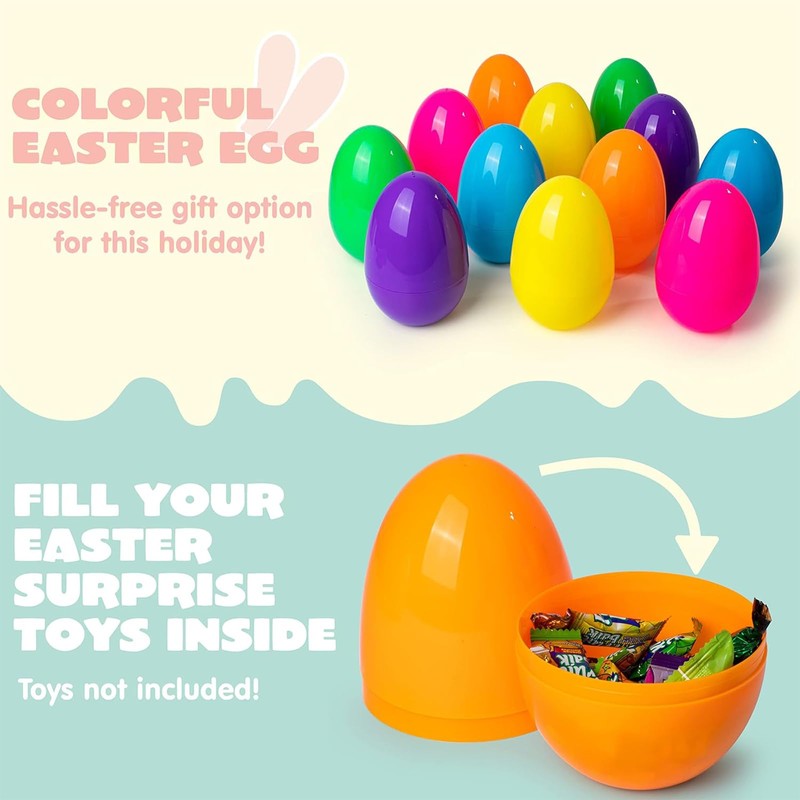 - Customizable Surprises: Our plastic eggs are not just pretty decorations; they are fully fillabale! Each egg can be easily opened to stash fun surprises like candies, small toys, or personal notes. This means you can customize each egg to match the preferences of your family and friends, making every Easter egg hunt even more special and engaging as everyone discovers unique treasures hidden inside.