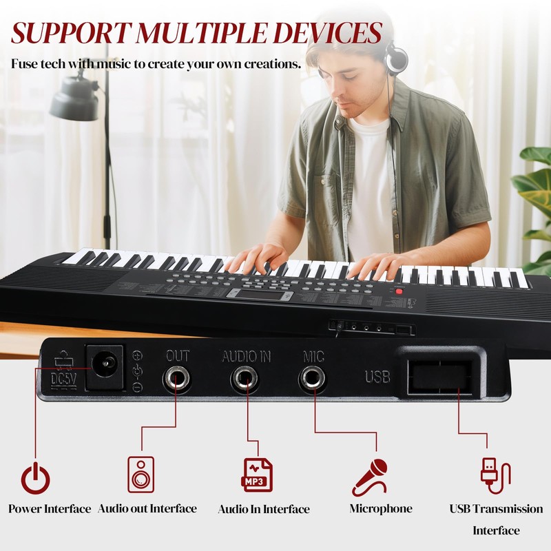 • PORTABLE &HUMANIZED DESIGN: This electronic keyboards can be powered by a power adapter(included) or 4 AA batteries (not included)so that you can play anywhere. It not only can be connected to a microphone to achieve more shocking sound effects but also can be connected to headphones to enjoy your music world