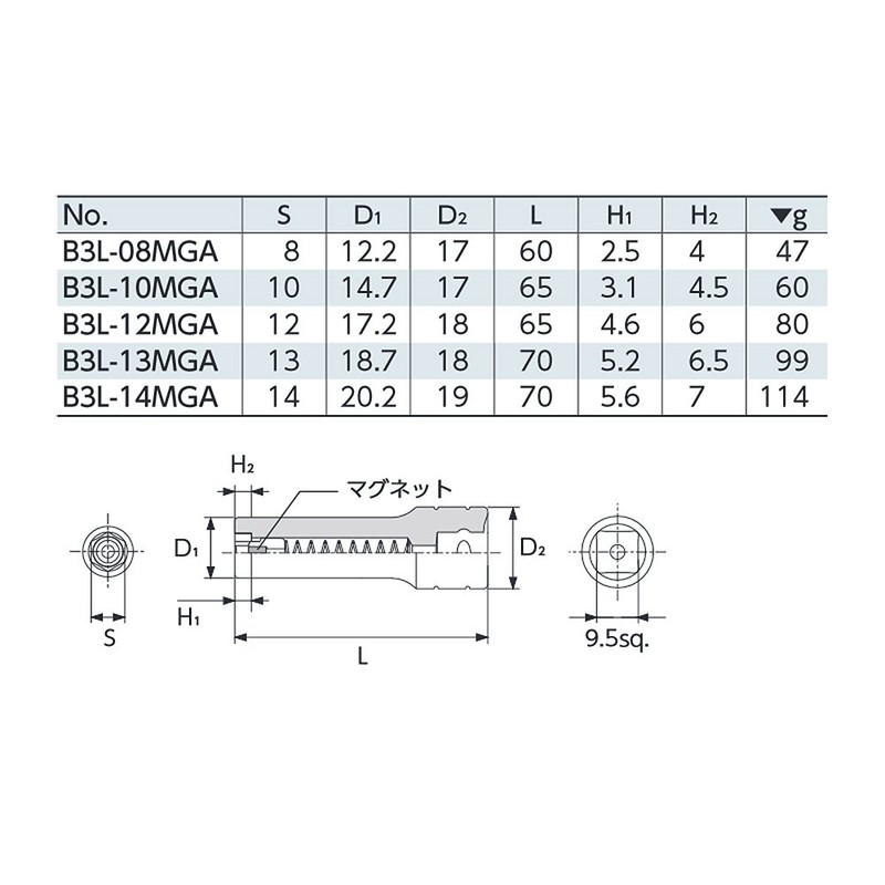京都機械工具(KTC) 9.5mm (3/8インチ) マグネットディープソケット B3L-14MGA