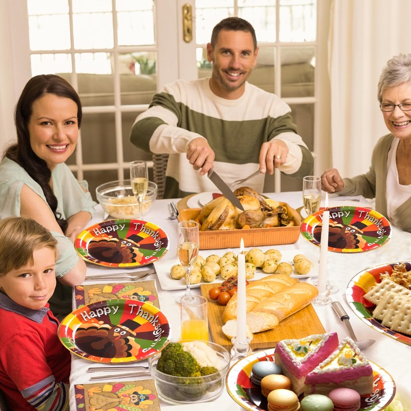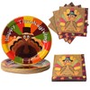 - Vibrant Colors: Plates showcase a colorful turkey design with a black top hat, while napkins depict a smiling turkey in fall hues.
