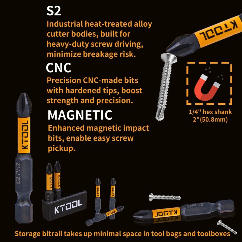 Engineered for professionals and DIY enthusiasts, the KTOOL Impact Driver Bit Set delivers unmatched durability and precision. Crafted from proprietary S2 steel alloy, these industrial-grade bits extreme torque testing, outperforming standard bits by 50x in lifespan. The hardened forged tips bite deeper into PH2 screws without stripping, making them essential for automotive repairs, heavy timber construction, and HVAC installations.
