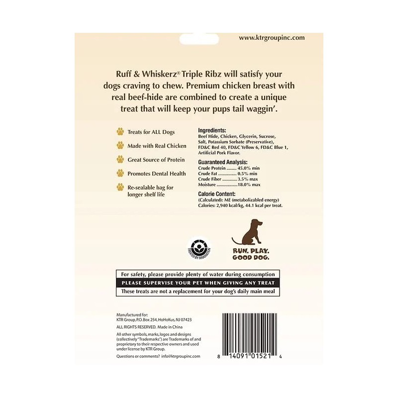 KTR Ruff & WHISKERZ Triple Ribz Rawhide Treat for Dog | Made with Real Beef Hide and Chicken | Satisfies Dogs Craving to Chew | 18ct