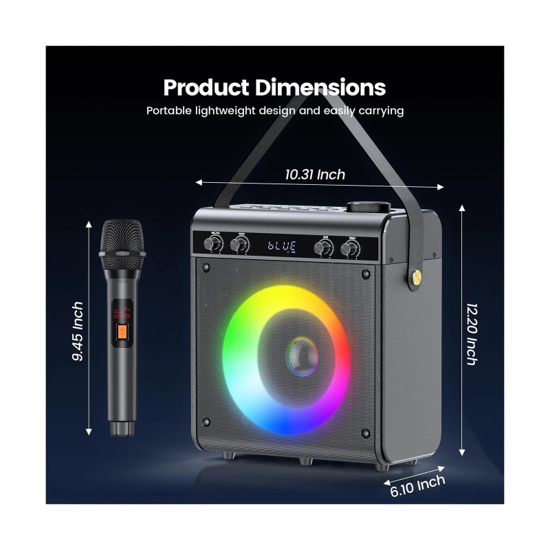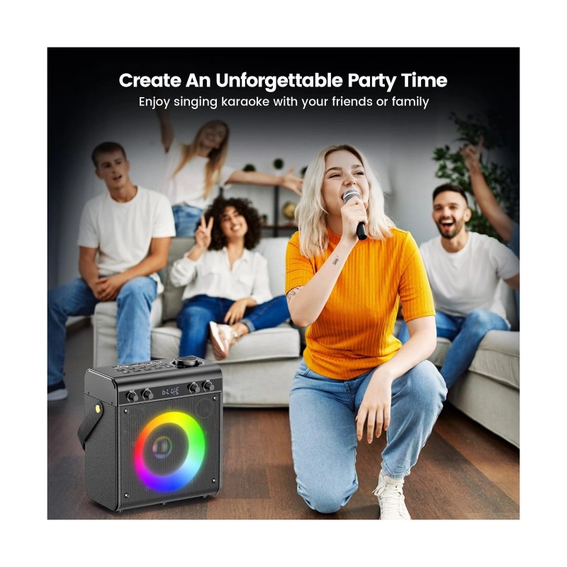- All-in-One Karaoke : Unleash your inner rockstar with this versatile karaoke machine! Featuring a built-in 30W speaker, 2 wireless microphones for duets, easy-to-use controls, and vibrant LED lights. 6-in-1 Wireless Connectivity Bluetooth 5.1, USB/TF/AUX ports, FM radio, and 2 wireless mics. Perfect for karaoke, parties or outdoor camping