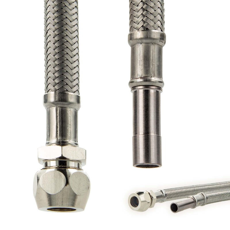- Flexible connection hose with inner hose HDPE, braided stainless steel 1.4301, connections brass (nickel-plated outside), manufactured and tested according to KTW-A, W 270 DVGW