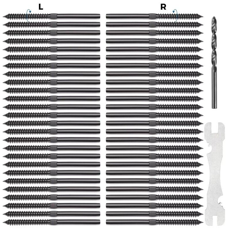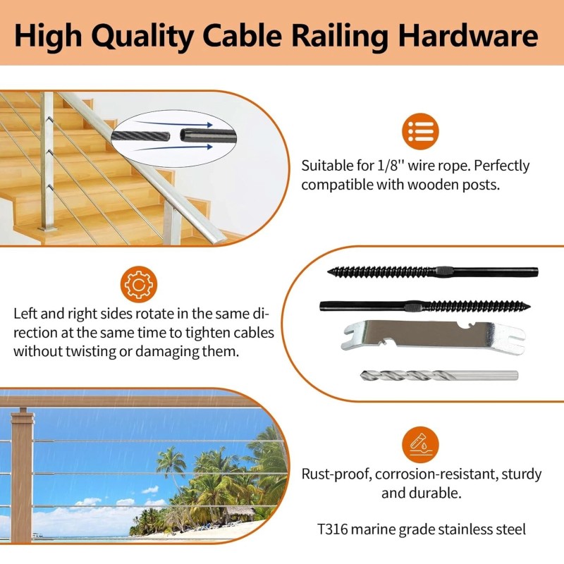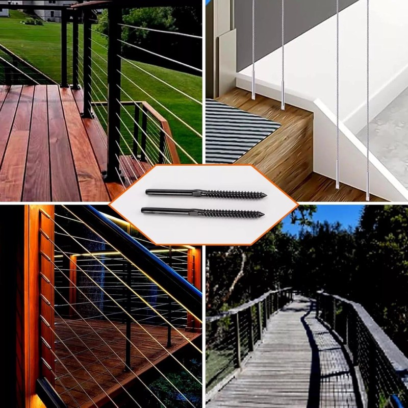 Compatible Cable: Designed for 1/8" OD cable in railing systems, the thread screws are ideal for timber or wood posts. With the right and left-hand thread design, the kit allows for easy tension adjustment, ensuring the cable remains securely in place without becoming loose or damaged.