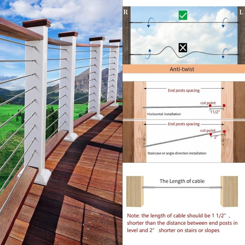 Sleek Design: Featuring a modern black deck railing design, this kit offers a clean and elegant appearance. The lag screws can be directly drilled into wood to adjust tightness, eliminating the need for extra turnbuckles or tensioners. It provides a minimalist look without obstructing your view.