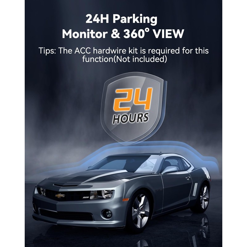 - 【24 Hours Parking Mode】When you park your car, the dash cam will automatically switch to parking mode for continuous monitoring. Delayed recording can effectively compress videos, saving power and storage space. The G-sensor can quickly detect sudden collisions or impacts, locking the relevant footage in time to help you understand any incidents that occur in your car. (This feature requires the purchase of the ACC hardwire kit.)