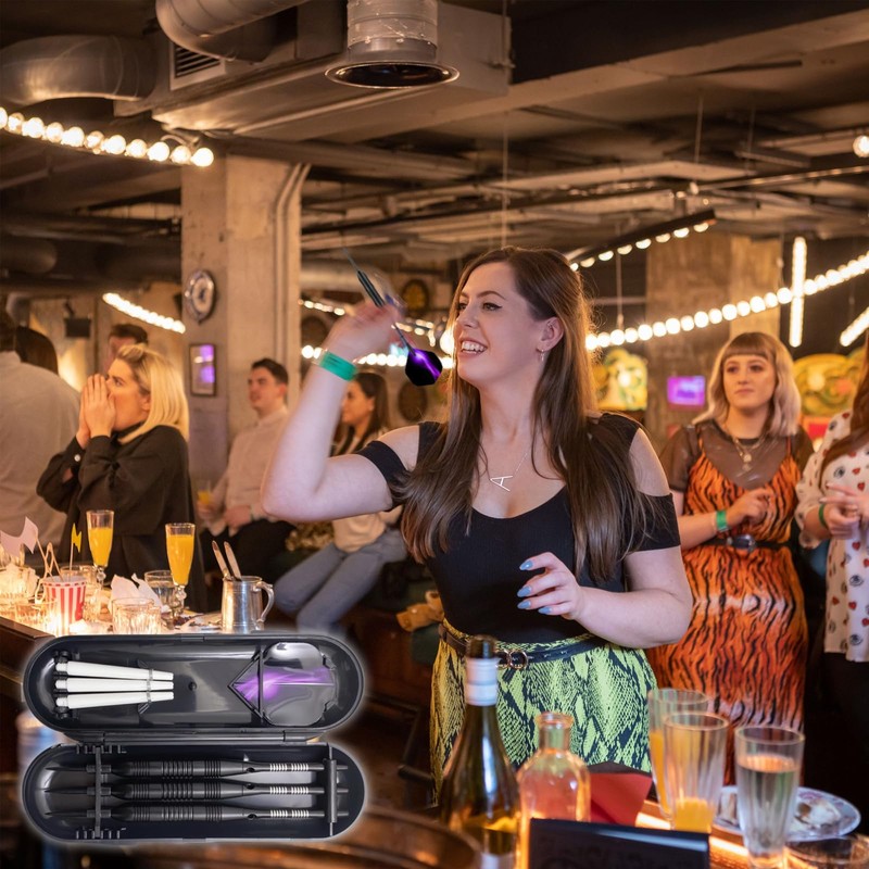 Crafted from premium material, these darts feature durable aluminum shafts and steel tips, ensuring they stay sharp and firm on the dartboard without bouncing off. The strategic design of our darts, including ergonomic wide glide flights, offers increased speed and reduced drag, all while providing a comfortable grip and balanced handling.