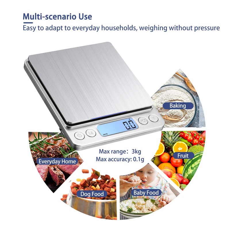 - 【PORTABLE】: Small size, the size of the product is only 4 inx 5 in x 0.75 in, which is convenient to carry, occupies small space during use, and is convenient for storage. Electronic scales can be used to weigh vegetables, fruits, baked ingredients, daily use household articles and pet foods. The digital kitchen scale has double trays that can be replaced depending on the different objects