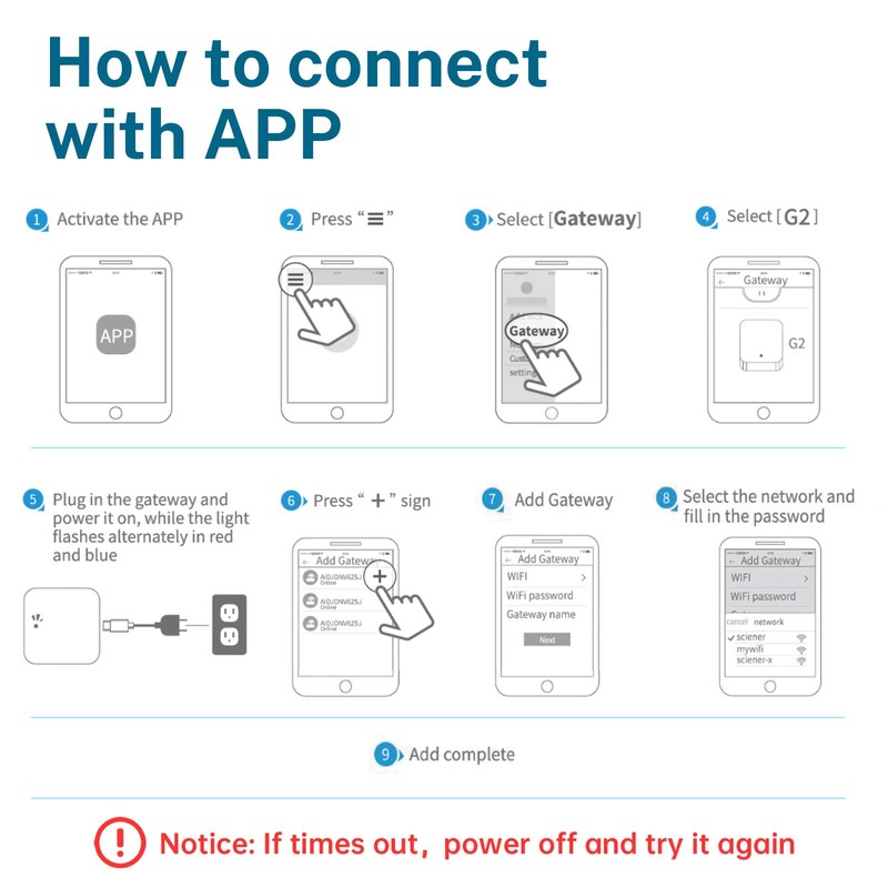 - Precauciones: una puerta de enlace se puede equipar con innumerables cerraduras, pero debido a que la distancia entre la cerradura y la puerta de enlace debe mantenerse dentro de 10 metros, recomendamos que la relación de la cerradura a la puerta de enlace sea 1:1