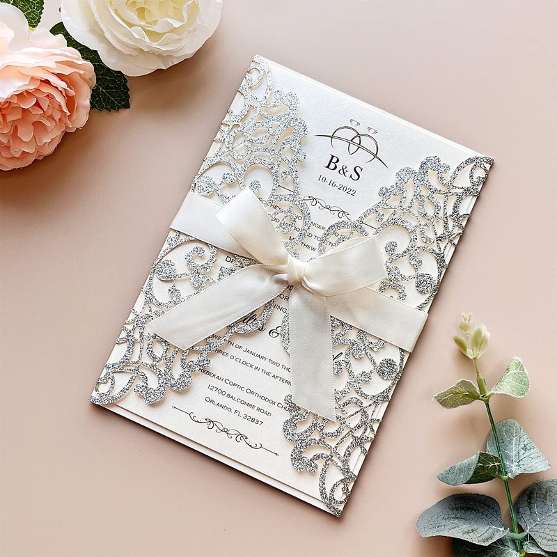 - Silver laser cut wedding invitation kit Included : 50 laser cut invitations pockets, 50 blank Pearlescent inner sheets, 50 ivory Self-adhesive bowknot, 50 envelopes, 50 envelopes seals.